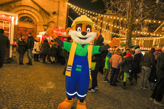 Das Baustellen-Maskottchen der Netzgesellschaft Düsseldorf, das Erdmännchen Sandi, ist an diesem Tag auch vor Ort und verteilt eine leckere Süßigkeit an Groß und Klein.